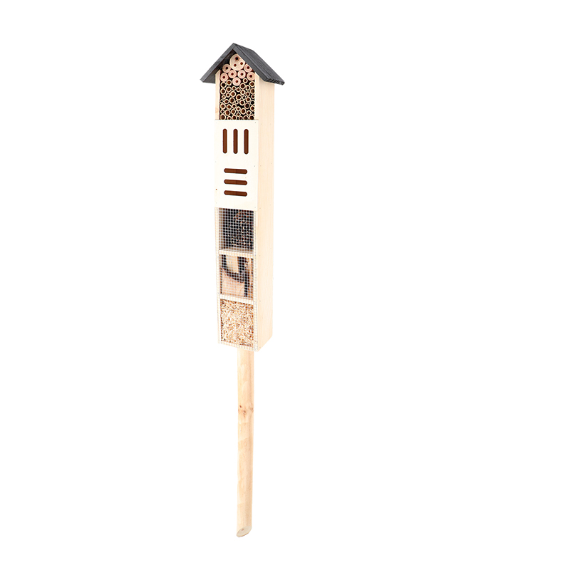 Insektenhaus mit Pfahlbefestigung. Dieses Insektenhaus verfügt über sechs verschiedene Kammern und ist damit der ideale Nist- und Zufluchtsort für verschiedene nützliche Insekten. Dank des stabilen Pfahls kann das Häuschen überall zwischen Blumen und Pflanzen platziert werden. Es unterstützt aktiv die Bestäubung und das natürliche Ökosystem.