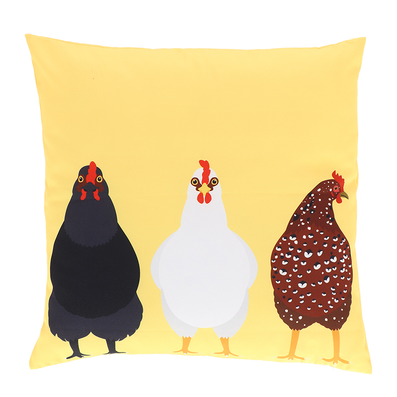 Outdoor-Kissen mit charmantem Motiv von Hühner. Vorder- und Rückseite des Kissens sind mit unterschiedlichen Motiven bedruckt. Platzieren Sie zwei Kissen nebeneinander, um das vollständige Bild zu erhalten.