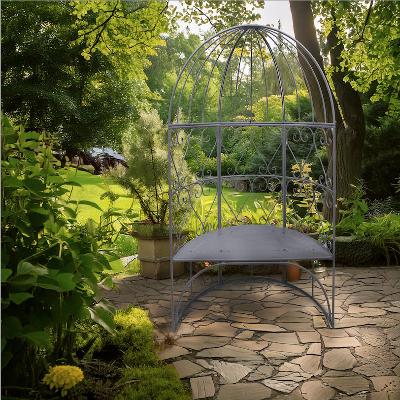 Creëer een nostalgische en authentieke sfeer in de tuin. Dit elegante paviljoen met bank heeft een klassieke uitstraling en geeft de tuin een Engelse ambiance. Laat de achterkant begroeien (met bv doornroze rozen, listeria of herera) om er een intieme en beschutte plek van te maken.