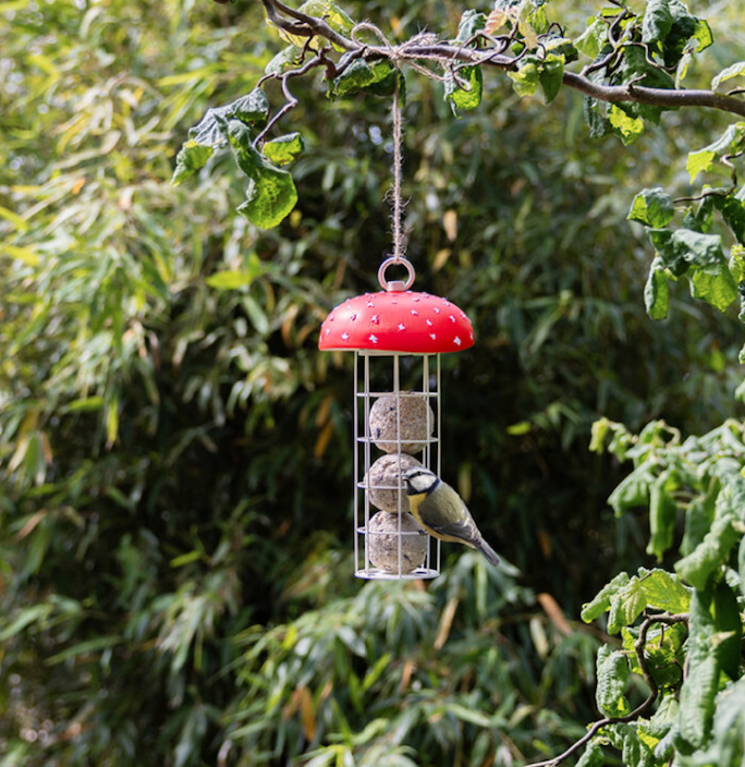 Deze vliegenzamvetbollenautomaat is perfect voor vetbollen zonder net. Door de open structuur kunnen de vogels de voederbak van alle kanten benaderen. De vliegenzwamvetbollenautomaat is eenvoudig (bij) te vullen door de ring los te draaien en het deksel op te tillen.